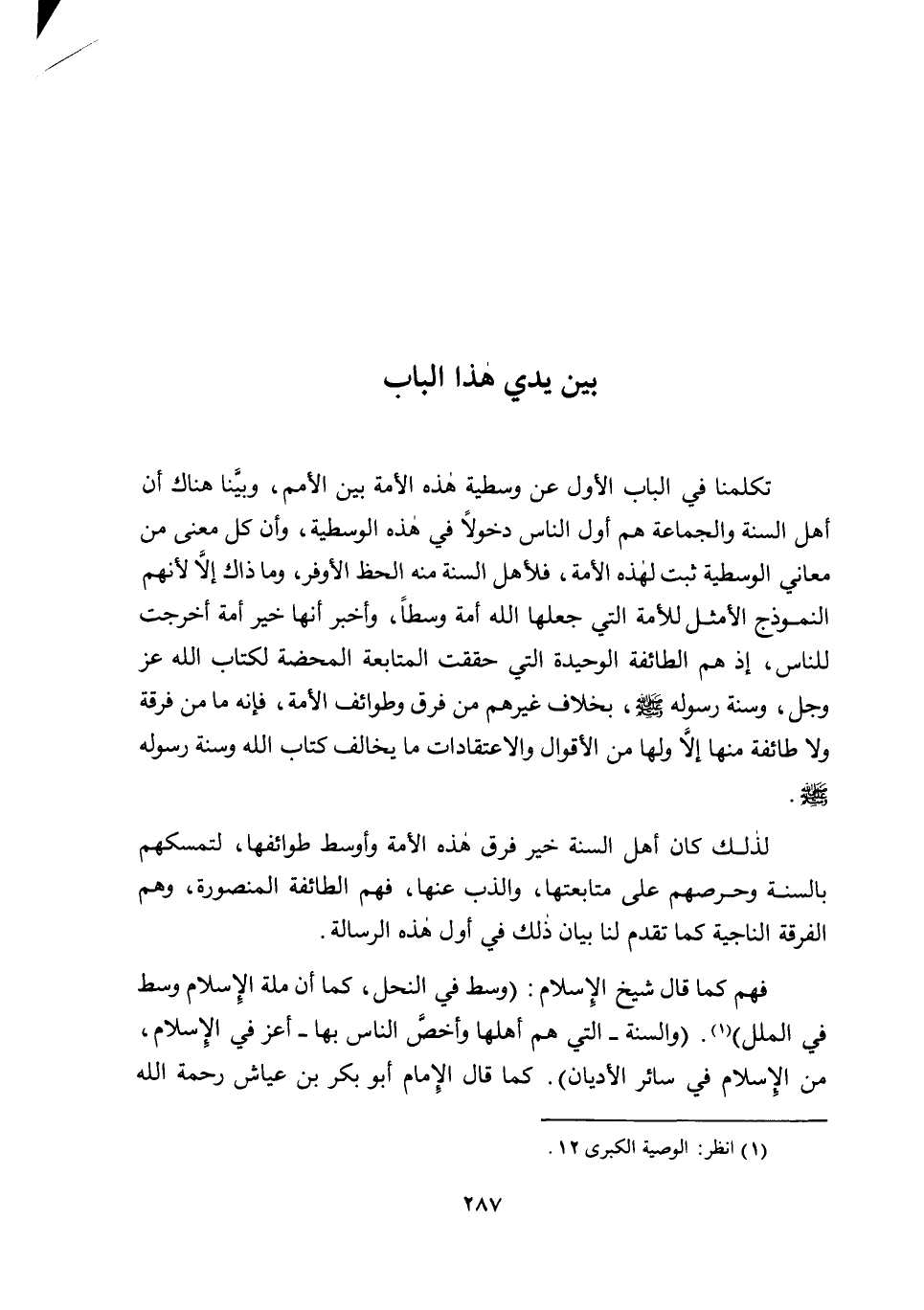 تكلمنا في الباب الأول عن وسطية هذه الأمة بين الأمة، وبينا هناك أن أهل السنة والجماعة هم أول الناس دخولًا في هذه الوسطية، وأن كل معنى من معاني الوسطية ثبت لهذه الأمة؛ فلأهل السنة منه الحظ الأوفر، وما ذاك إلا لأنهم النموذج الأمثل للأمة التي جعلها الله أمة وسطًا، وأخبر أنها خير أمة أخرجت للناس؛ إذ هم الطائفة الوحيدة التي حققت المتابعة المحضة لكتاب الله عز وجل، وسنة رسوله صلى الله عليه وسلم، بخلاف غيرهم من فرق وطوائف الأمة، فإنه ما من فرقة ولا طائفة منها إلا ولها من الأقوال والاعتقادات ما يخالف كتاب الله وسنة رسوله صلى الله عليه وسلم.