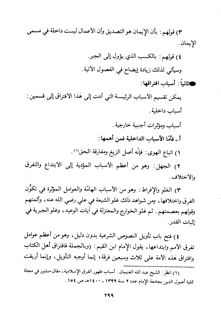 1 انظر: الشيخ عبد الله الغنيمان. أسباب ظهور الفرق الإسلامية، مقال منشور في مجلة كلية أصول الدين بجامعة الإمام عدد 2 سنة 1399- 1400 هـ ص 154.