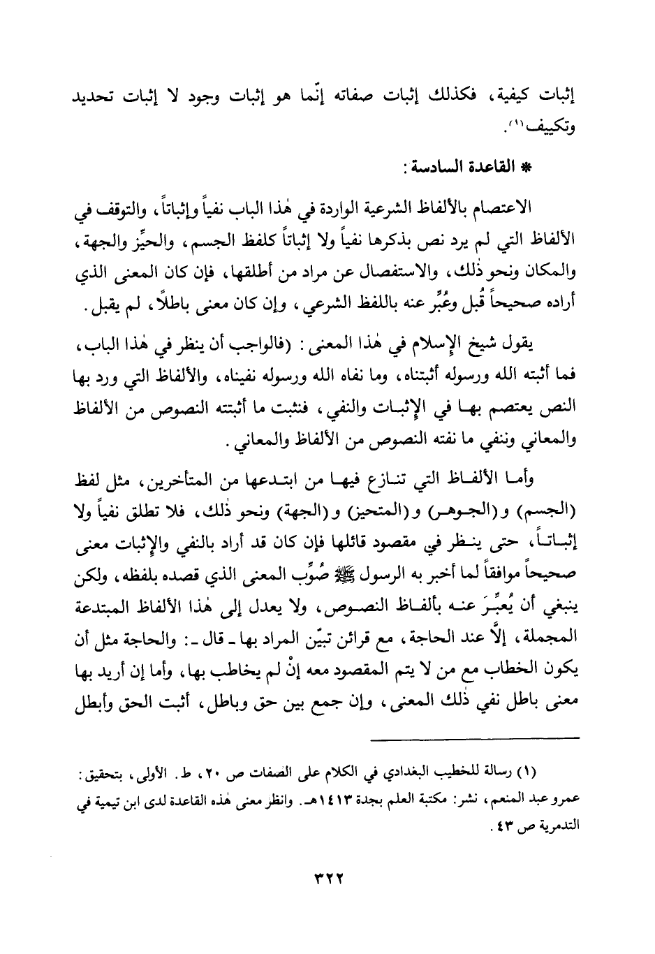 1 رسالة للخطيب البغدادي في الكلام على الصفات ص 20، ط. الأولى، بتحقيق: عمرو عبد المنعم، نشر: مكتبة العلم بجدة 1413 هـ. وانظر معنى هذه القاعدة لدى ابن تيمية في التدمرية ص 43.