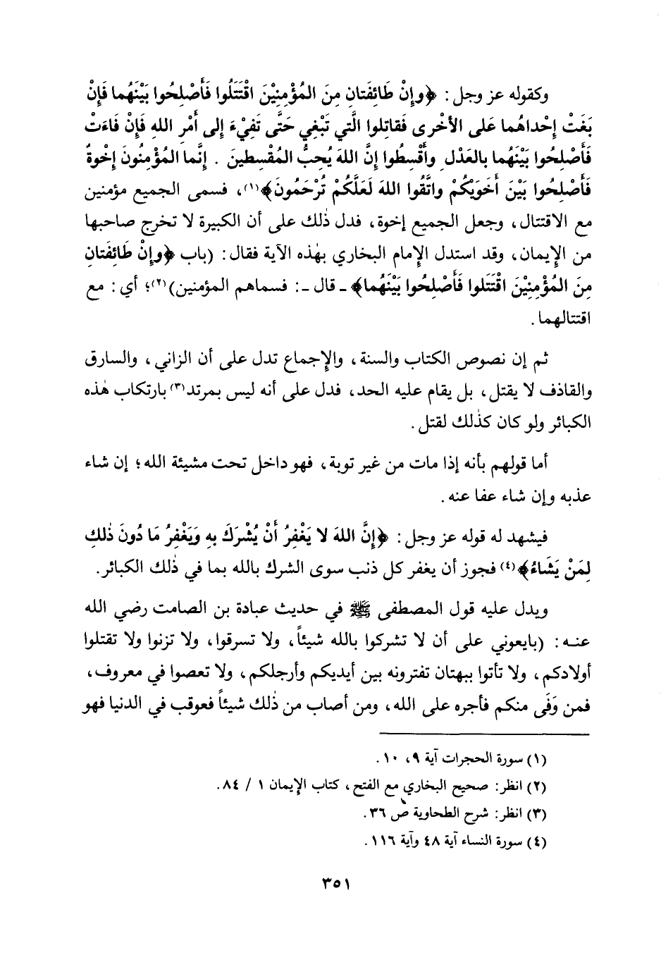 وكقوله عز وجل: {وَإِنْ طَائِفَتَانِ مِنَ الْمُؤْمِنِينَ اقْتَتَلُوا فَأَصْلِحُوا بَيْنَهُمَا فَإِنْ بَغَتْ إِحْدَاهُمَا عَلَى الْأُخْرَى فَقَاتِلُوا الَّتِي تَبْغِي حَتَّى تَفِيءَ إِلَى أَمْرِ اللَّهِ فَإِنْ فَاءَتْ فَأَصْلِحُوا بَيْنَهُمَا بِالْعَدْلِ وَأَقْسِطُوا إِنَّ اللَّهَ يُحِبُّ الْمُقْسِطِينَ، إِنَّمَا الْمُؤْمِنُونَ إِخْوَةٌ فَأَصْلِحُوا بَيْنَ أَخَوَيْكُمْ وَاتَّقُوا اللَّهَ لَعَلَّكُمْ تُرْحَمُونَ} 1، فسمي الجميع مؤمنين، مع الاقتتال، وجعل الجميع إخوة؛ فدل ذلك على أن الكبيرة لا تخرج صاحبها من الإيمان، وقد استدل الإمام البخاري بهذه الآية فقال: "باب {وَإِنْ طَائِفَتَانِ مِنَ الْمُؤْمِنِينَ اقْتَتَلُوا فَأَصْلِحُوا بَيْنَهُمَا} قال: فسماهم المؤمنين"2؛ أي: مع اقتتالهما.