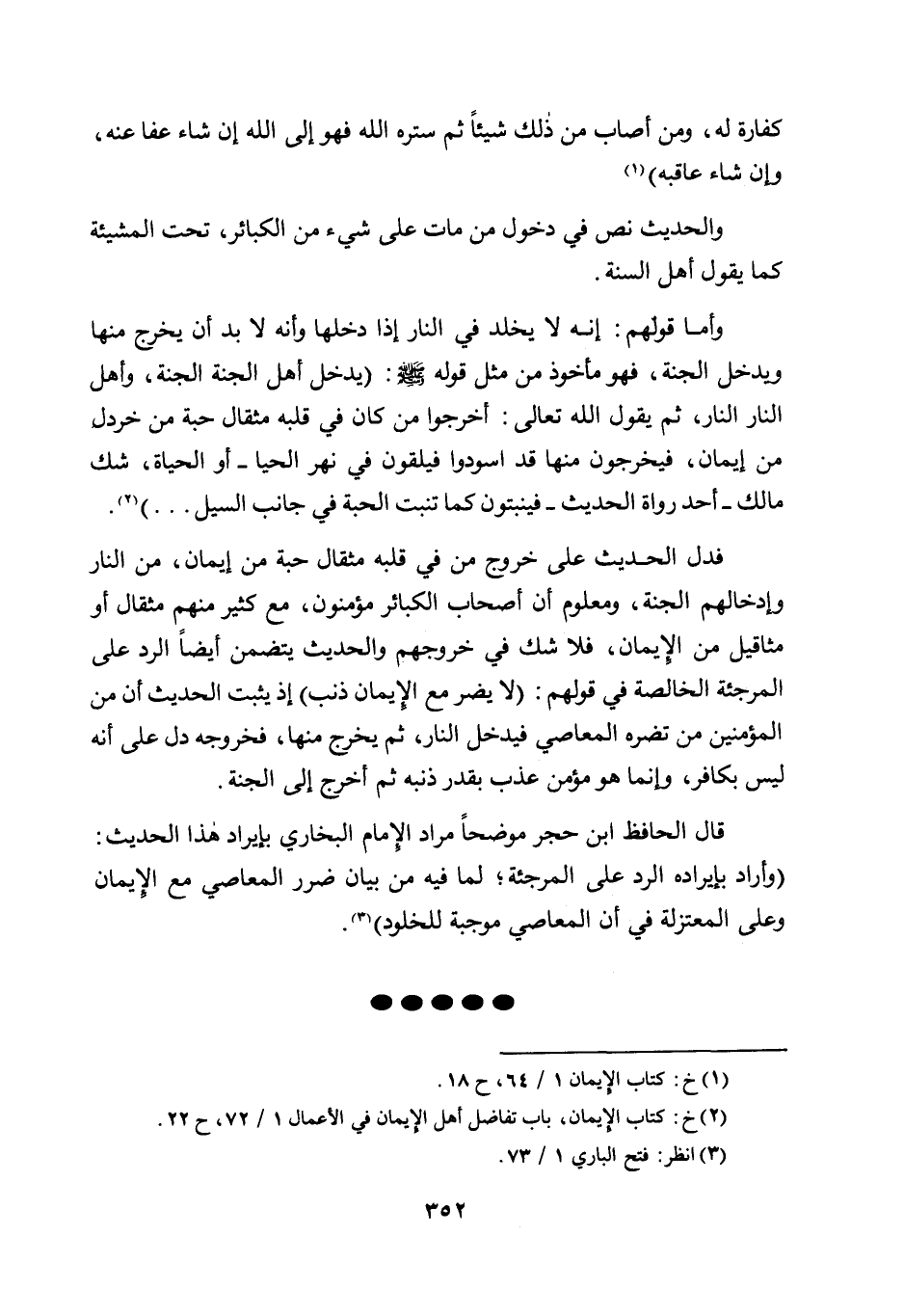 وأما قولهم: إنه لا يخلد في النار إذا دخلها، وأنه لا بد أن يخرج منها ويدخل الجنة؛ فهو مأخوذ من مثله قوله صلى الله عليه وسلم: "يدخل أهل الجنة، وأهل النار النار، ثم يقول الله تعالى: أخرجوا من كان في قلبه مثقال حبة من خردل من إيمان، فيخرجون منها قد اسودوا فيلقون في نهر الحيا -أو الحياة، شك مالك أحد رواة الحديث- فينبتون كما تنبت الحبة في جانب السيل" 2.