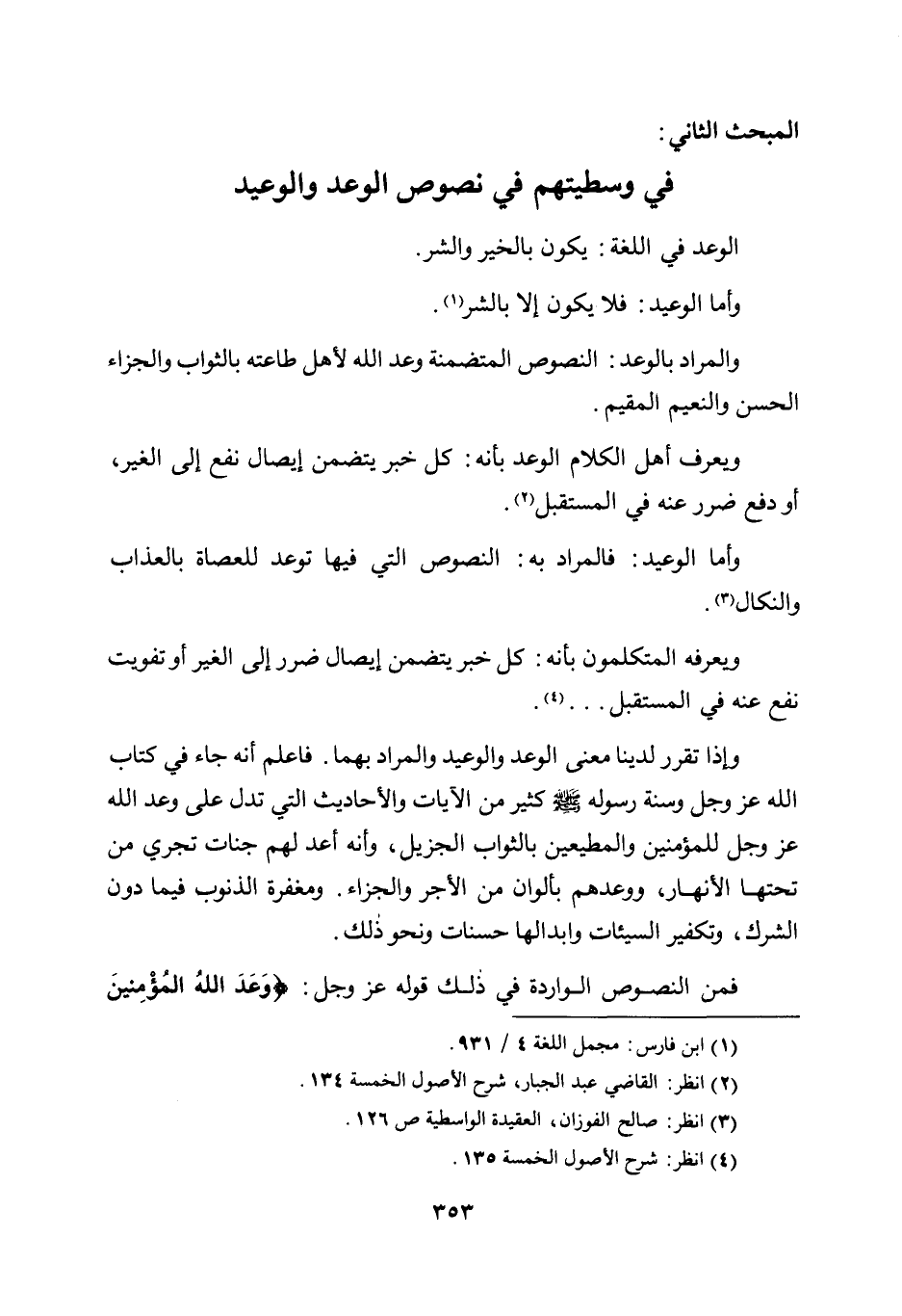 وأما الوعيد: فالمراد به: النصوص التي فيها توعد للعصاة بالعذاب والنكال3.