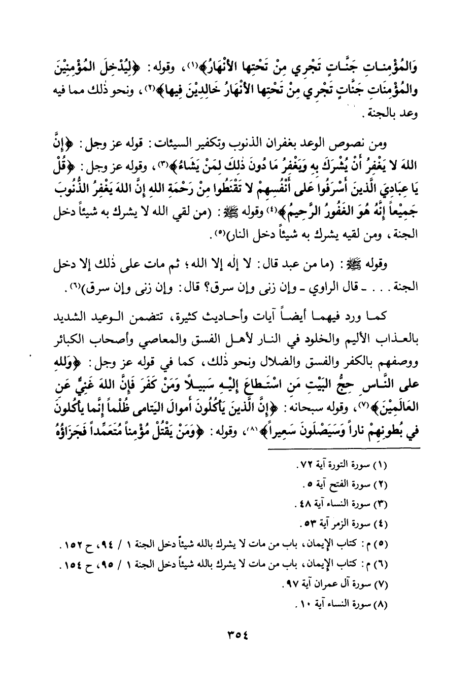 كما ورد فيهما أيضًا آيات وأحاديث كثيرة، تتضمن الوعيد الشديد بالعذاب الأليم والخلود في النار لأهل الفسق والمعاصي وأصحاب الكبائر ووصفهم بالكفر والفسق والضلال ونحو ذلك، كما في قوله عز وجل: {وَلِلَّهِ عَلَى النَّاسِ حِجُّ الْبَيْتِ مَنِ اسْتَطَاعَ إِلَيْهِ سَبِيلًا وَمَنْ كَفَرَ فَإِنَّ اللَّهَ غَنِيٌّ عَنِ الْعَالَمِين} 7، وقوله سبحانه: {إِنَّ الَّذِينَ يَأْكُلُونَ أَمْوَالَ الْيَتَامَى ظُلْمًا إِنَّمَا يَأْكُلُونَ فِي بُطُونِهِمْ نَارًا وَسَيَصْلَوْنَ سَعِيرًا} 8، وقوله: {وَمَنْ يَقْتُلْ مُؤْمِنًا مُتَعَمِّدًا فَجَزَاؤُهُ
