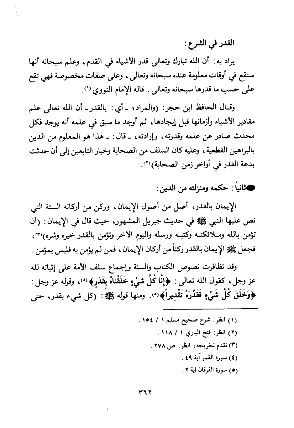 وقال الحافظ ابن حجر: "والمراد؛ أي: بالقدر- أن الله تعالى علم مقادير الأشياء وأزمانها قبل إيجادها، ثم أوجد ما سبق في علمه أنه يوجد؛ فكل محدث صادر عن علمه وقدرته، وإرادته، -قال- هذا هو المعلوم من الدين بالبراهين القطعية؛ وعليه كان السلف من الصحابة وخيار التابعين إلى أن حدثت بدعة القدر في أواخر زمن الصحابة"2.