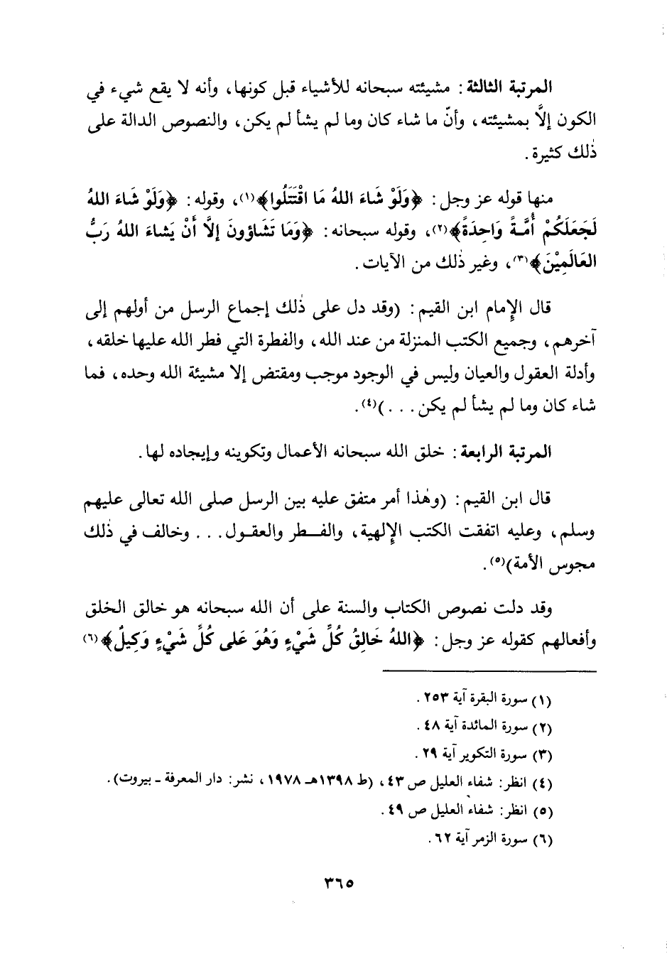 قال الإمام ابن القيم: "قد دل على ذلك إجماع الرسل من أولهم إلى آخرهم، وجميع الكتب المنزلة من عند الله، والفطرة التي فطر الله عليها خلقه، وأدلة العقول والعيان وليس فيا لوجود موجب ومقتض إلا مشيئة الله وحده؛ فما شاء كان وما لم يشأ لم يكن"4.