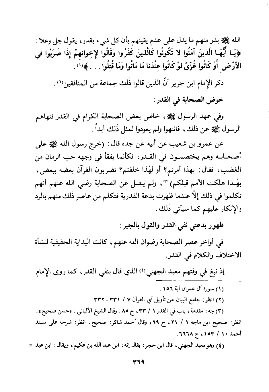 عن عمرو بن شعيب عن أبيه عن جده قال: "خرج رسول الله صلى الله عليه وسلم على أصحابه وهم يختصمون في القدر؛ فكأنما يفقأ في وجهه حب الرمان من الغضب، فقال: بهذا أمرتم؟ أو لهذا خلفتم؟ تضربون القرآن بعضه ببعض، بهذا هلكت الأمم قبلكم"3، ولم ينقل عن الصحابة رضي الله عنهم أنهم تكلموا في ذلك إلا عندما ظهرت بدعة القدرية فتكلم من عناصر ذلك منهم بالرد والإنكار عليهم كما سيأتي ذلك.