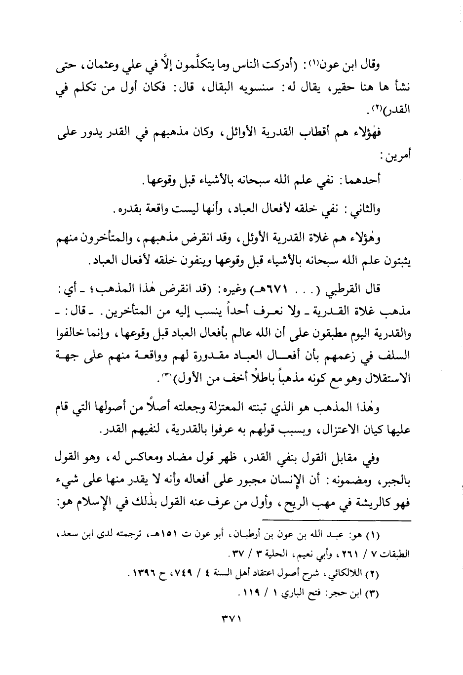 قال: والقدرية اليوم مطبقون على أن الله عالم بأفعال العباد قبل وقوعها؛ وإنما خالفوا السلف في زعمهم بأن أفعال العابد مقدورة لهم وواقعة منهم على جهة الاستقلال وهو مع كونه مذهبًا باطلًا أخف من الأول"3.