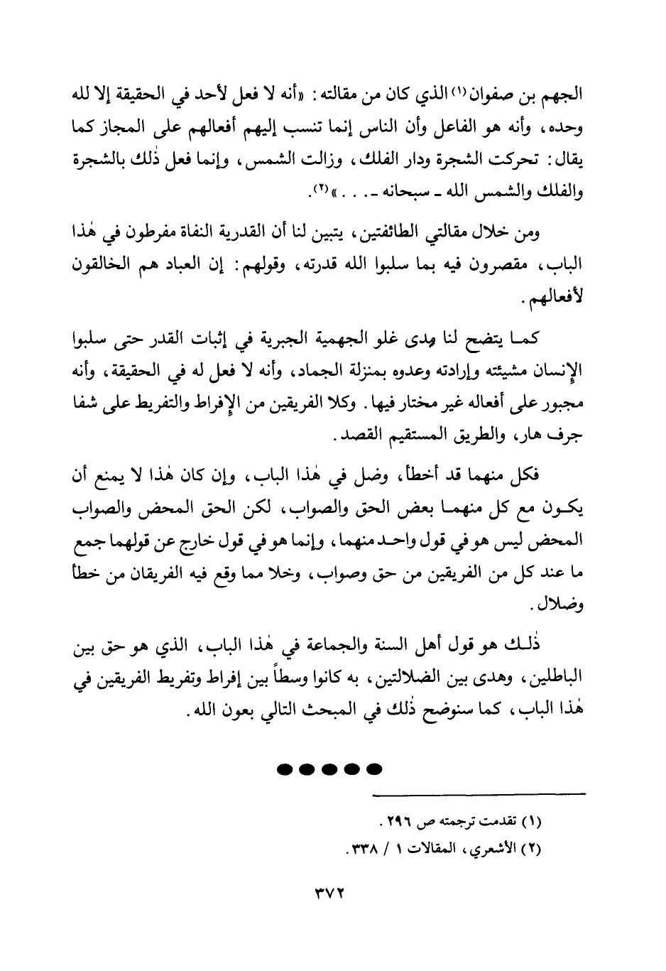 الجهم بن صفوان1 الذي كان من مقالته: "وأنه لا فعل لأحد في الحقيقة إلا الله وحده، وأنه هو الفاعل وأن الناس إنما تنسب إليهم أفعالهم على المجاز كما يقال: تحركت الشجرة ودار الفلك، وزالت الشمس؛ وإنما فعل ذلك بالشجرة والفلك والشمس الله -سبحانه-"2.