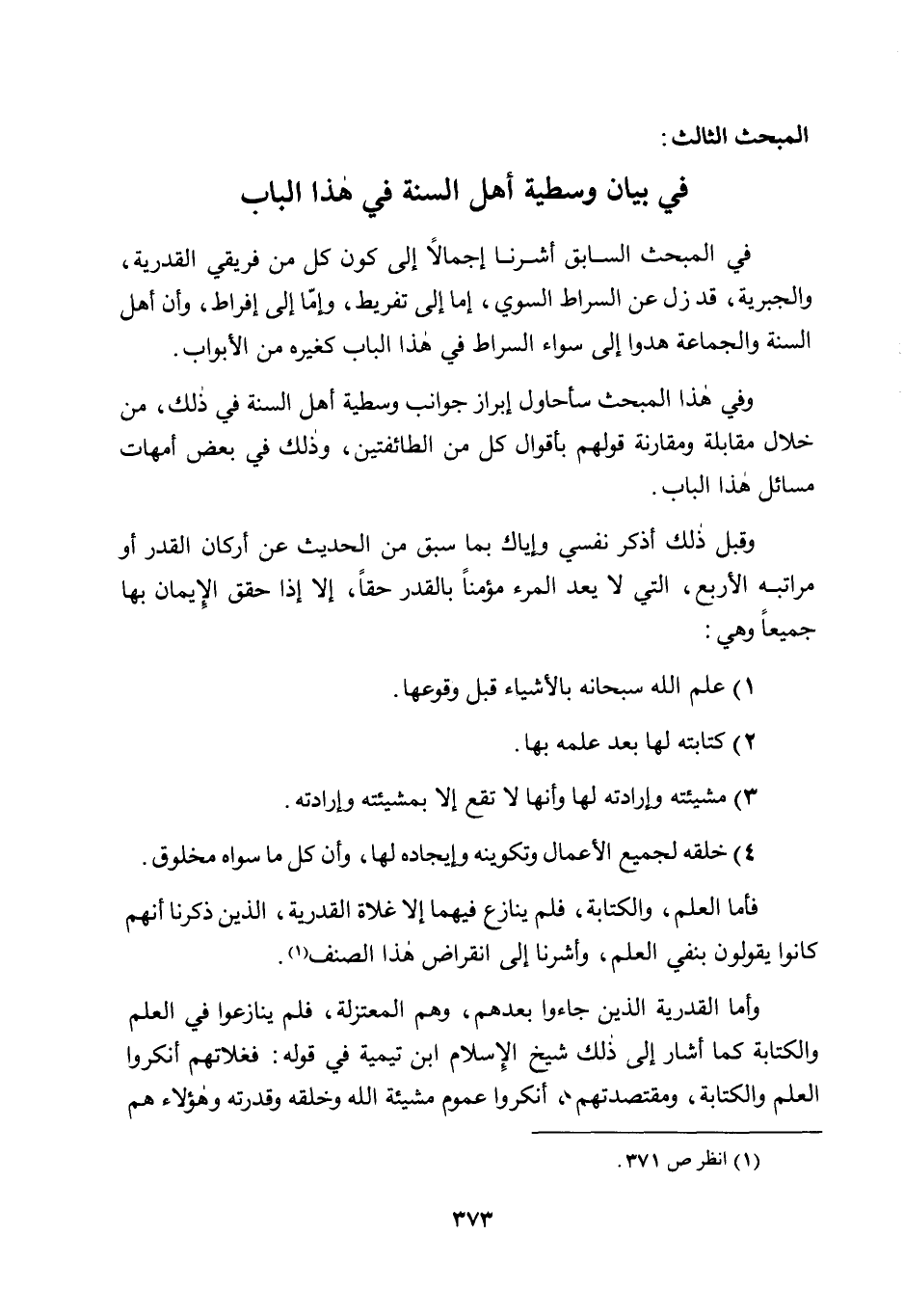 في المبحث السابق أشرنا إجمالًا إلى كون كل من فريقي القدرية، والجبرية، قد زال عن الصراط السوي؛ إما إلى تفريط، وإما إلى إفراط، وأن أهل السنة والجماعة هدوا إلى سواء الصراط في هذا الباب كغيره من الأبواب.