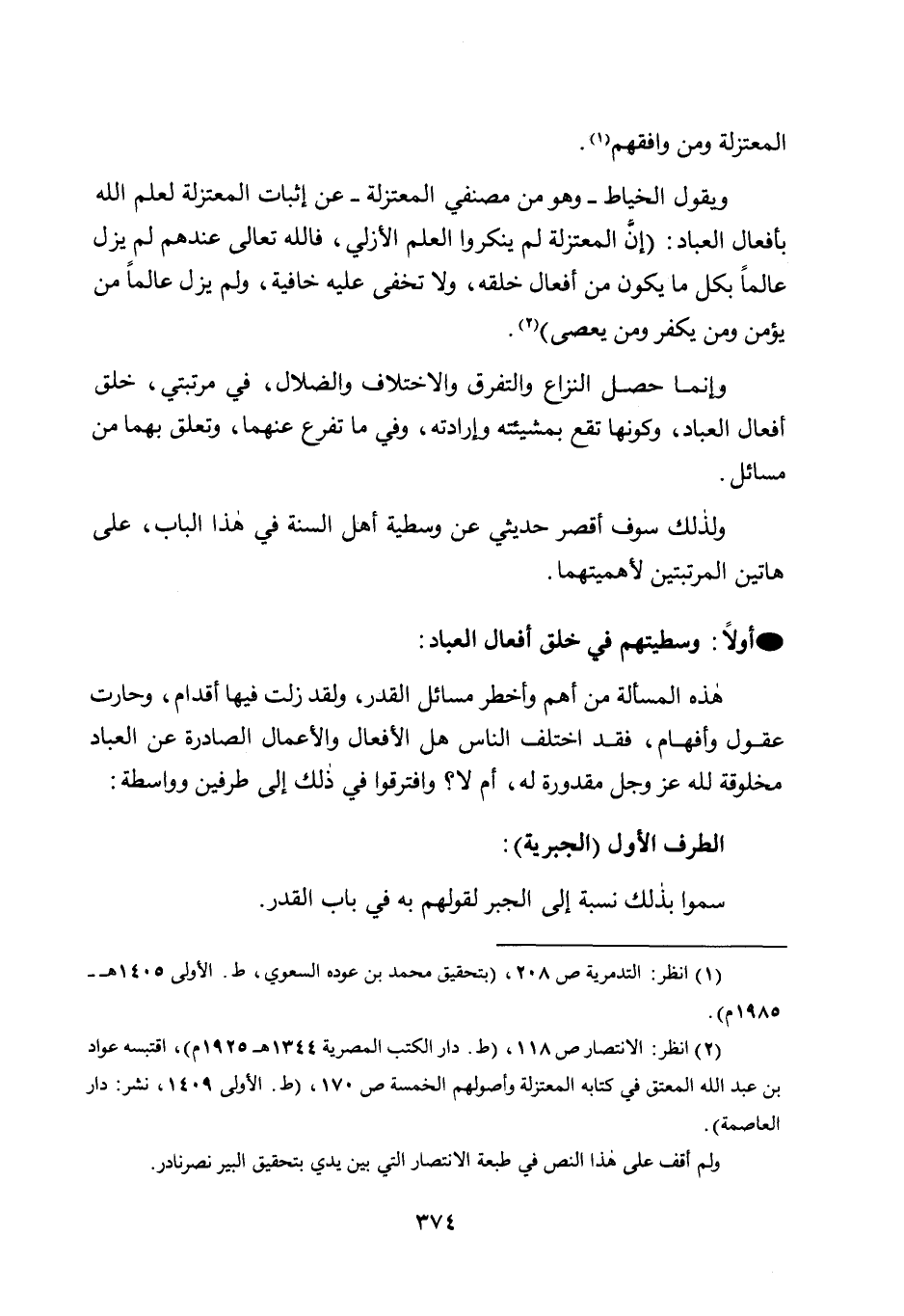 2 انظر: الانتصار ص118، "ط. دار الكتب المصرية 1344 هـ 1925 م"، اقتبسه عواد بن عبد الله المعتق في كتابه المعتزلة وأصولهم الخمسة ص170، "ط. الأولى 1409، نشر: دار العاصمة".