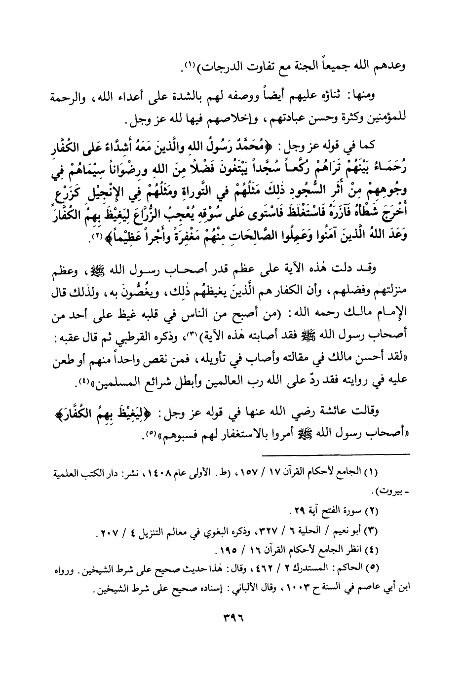 وقد دلت هذه الآية على عظم قدر أصحاب رسول الله صلى الله عليه وسلم، وعظم منزلتهم وفضلهم، وأن الكفار هم الذين يغيظهم ذلك، ويغصون به، ولذلك قال الإمام مالك رحمه الله: "من أصبح من الناس في قلبه غيظ على أحد من أصحاب رسول الله صلى الله عليه وسلم فقد أصابته هذه الآية"3، وذكره القرطبي ثم قال عقبه: "لقد أحسن مالك في مقالته وأصاب في تأويله؛ فمن نقص واحدًا منهم أو طعن عليه في روايته فقد رد على الله رب العالمين وأبطل شرائع المسلمين"4.