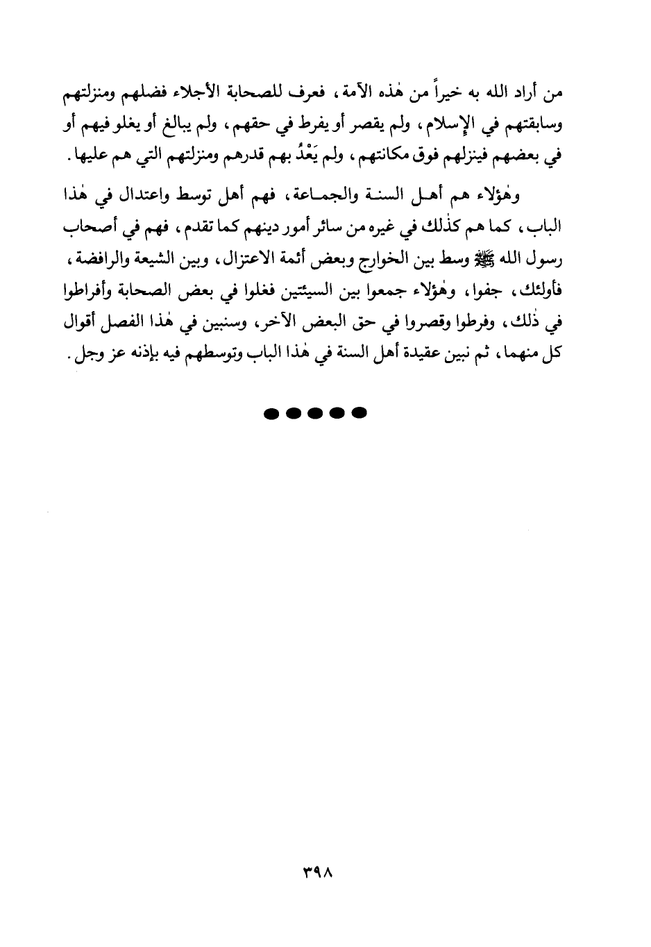 من أراد الله به خيرًا من هذه الأمة، فعرف للصحابة الأجلاء فضلهم ومنزلتهم وسابقتهم في الإسلام، ولم يقصر أو يفرط في حقهم، ولم يبالغ أو يغلو فيهم أو في بعضهم فيزلهم فوق مكانتهم، ولم يعد بهم قدرهم ومنزلتهم التي هم عليها.