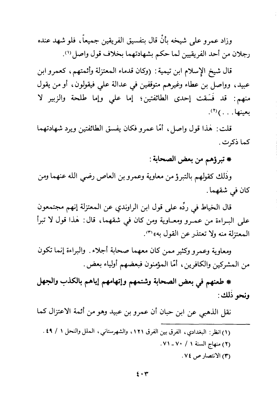 قال الخياط في رده على قول ابن الراوندي عن المعتزلة إنهم مجتمعون على البراءة من عمرو ومعاوية ومن كان في شقهما، قال: هذا قول لا تبرأ المعتزلة منه ولا تعتذر عن القول به"3.