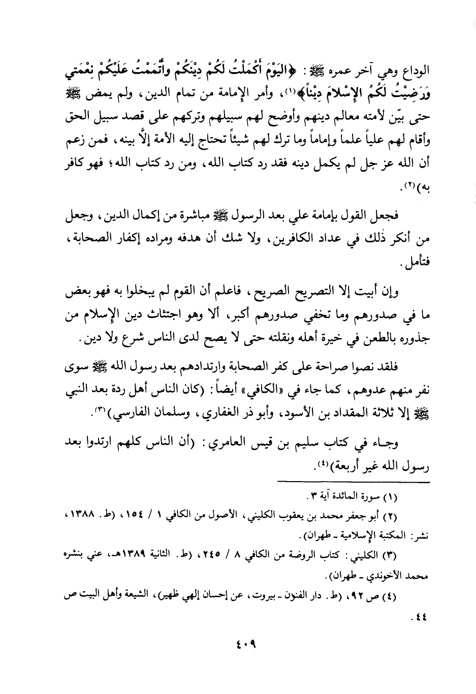 فجعل القول بإمامة على بعد الرسول صلى الله عليه وسلم مباشرة من إكمال الدين، وجعل من أنكر ذلك في عدد الكافرين، ولا شك أن هدفه ومراده إكفار الصحابة فتأمل.