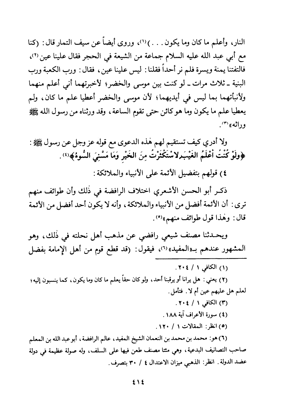 ويحدثنا مصنف شيعي رافضي عن مذهب أهل نحلته في ذلك، وهل المشهور عندهم بـ"المفيد"6، فيقول: "قد قطع قوم من أهل الإمامة بفضل