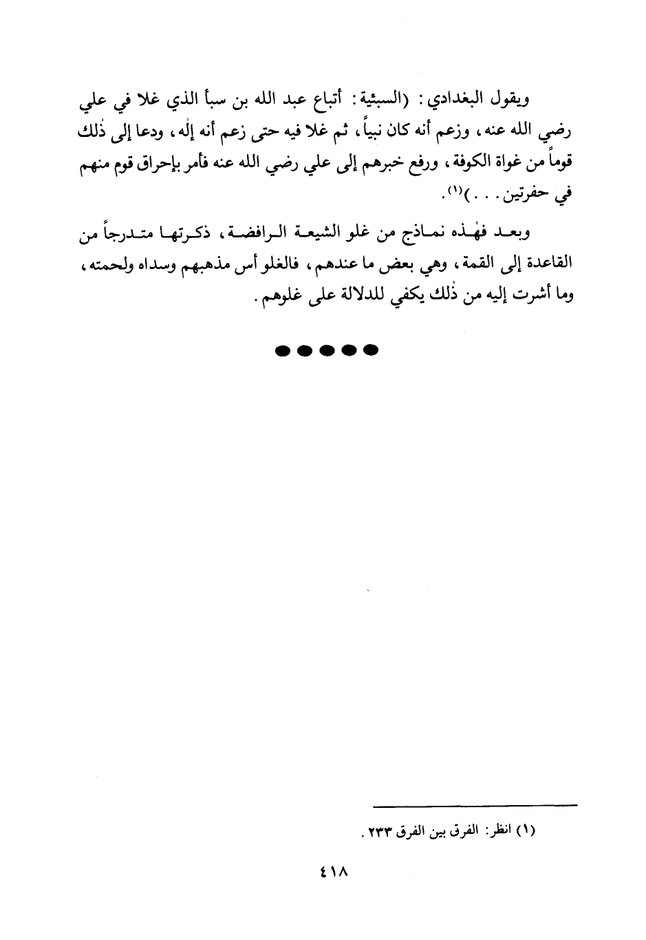 وبعد فهذه نماذج من غلو الشيعة الرافضة، ذكرتها متدرجًا في القاعدة إلى القمة، وهي بعض ما عندهم؛ فالغلو أسس مذهبهم وسداه ولحمته، وما أشرت إليه من ذلك يكفي للدلالة على غلوهم.