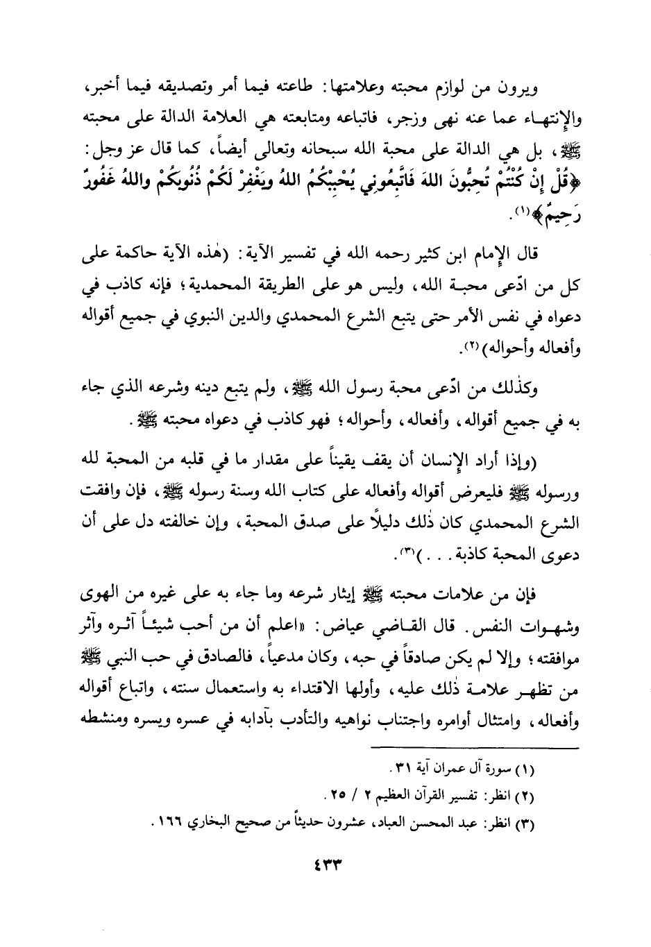 "وإذا أراد الإنسان أن يقف يقينًا على مقدار ما في قلبه من المحبة لله ورسوله صلى الله عليه وسلم فليعرض أقواله وأفعاله على كتاب الله وسنة رسوله صلى الله عليه وسلم؛ فإنه وافقت الشرع المحمدي كان ذلك دليلًا على صدق المحبة، وإن خالفته دل على أن دعوى المحبة كاذبة"3.