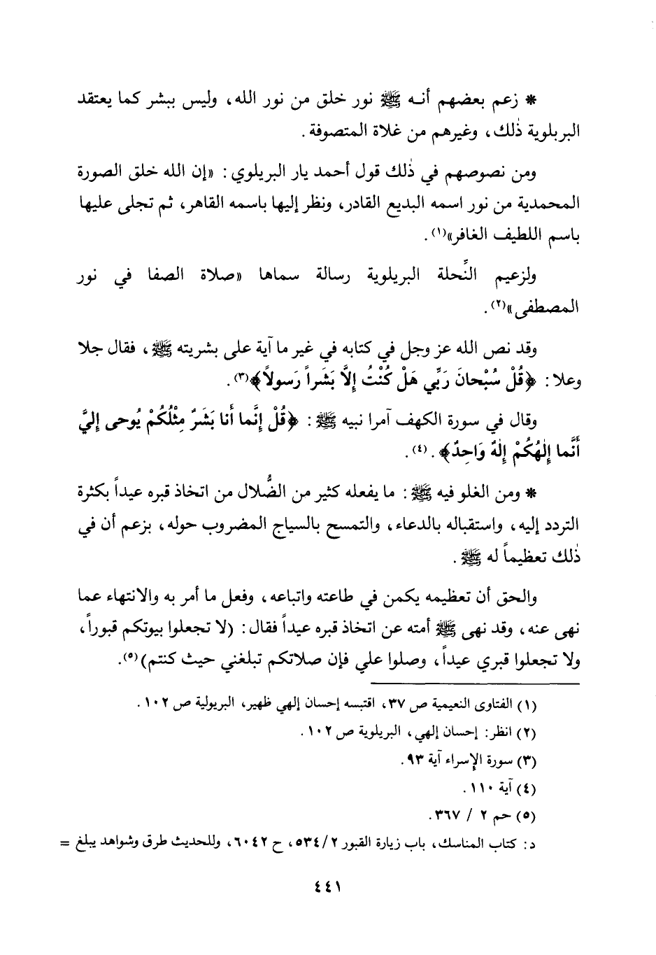 - زعم بعضهم أنه صلى الله عليه وسلم نور خلق من نور الله، وليس ببشر كما يعتقد البربلوية ذلك، وغيرهم من غلاة المتصوفة.