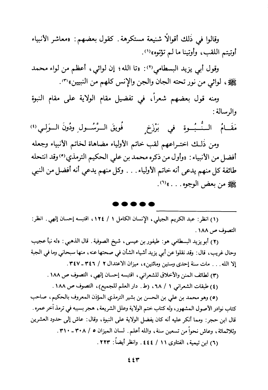 ومن ذلك اختراعهم لقب خاتم الأولياء مضاهاة لخاتم الأنبياء وجعله أفضل من الأنبياء: "وأول من ذكره محمد بن علي الحكيم الترمذي5، وقد انتحله طائفة كل منهم يدعي أنه خاتم الأولياء. وكل منهم يدعي أنه أفضل من النبي صلى الله عليه وسلم من بعض الوجوه"6.