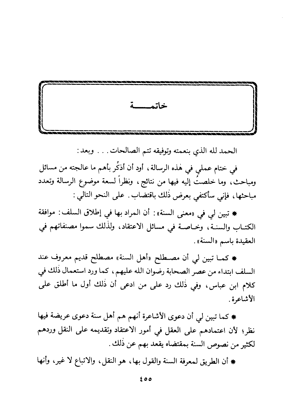 - كما تبين لي أن مصطلح "أهل السنة" مصطلح قديم معروف عند السلف ابتداء من عصر الصحابة رضوان الله عليهم، كما ورد استعمال ذلك في كلام ابن عباس، وفي ذلك رد على من ادعى أن ذلك أول ما أطلق على الأشاعرة.