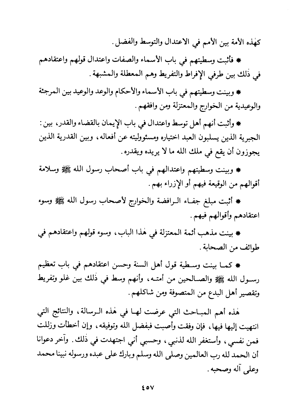 - كما بينت وسطية قول أهل السنة وحسن اعتقادهم في باب تعظيم رسول الله صلى الله عليه وسلم والصالحين من أمته، وأنهم وسط في ذلك بين غلو وتفريط وتقصير أهل البدع من المتصوفة ومن شاكلهم.