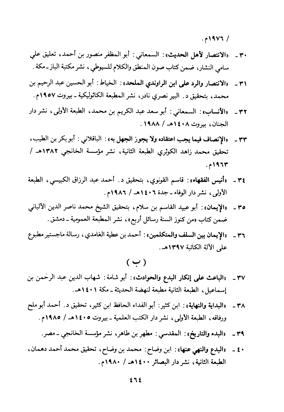 30- "الانتصار لأهل الحديث": السمعاني: أبو المظفر منصور بن أحمد، تعليق على سامي النشار ضمن كتاب صون المنطق والكلام للسيوطي، نشر مكتبة الباز - مكة.