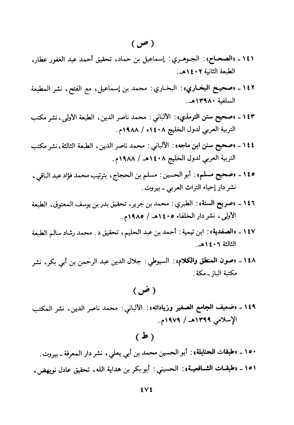 141- "الصحاح": الجوهري: إسماعيل بن حماد، تحقيق أحمد عبد الغفور عطار، الطبعة الثانية 1402هـ.