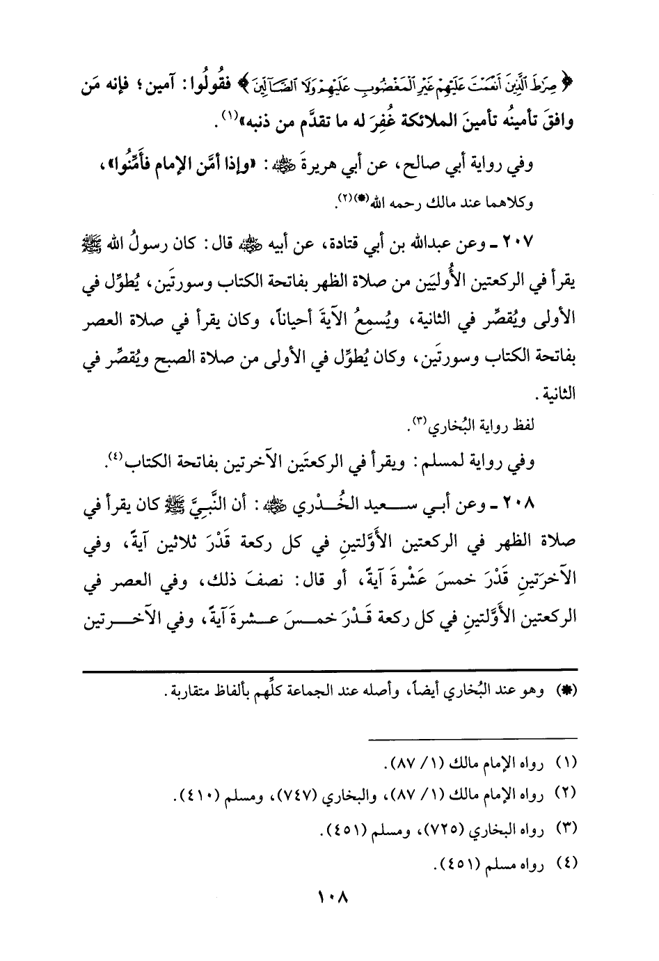 207 - وعن عبد اللَّه بن أبي قتادة، عن أبيه -رضي اللَّه عنه- قال: كان رسولُ اللَّه -صلى اللَّه عليه وسلم- يقرأ في الركعتين الأُوليَين من صلاة الظهر بفاتحة الكتاب وسورتَين، يُطوِّل في الأولى ويُقصِّر في الثانية، ويُسمِعُ الآيةَ أحيانًا، وكان يقرأ في صلاة العصر بفاتحة الكتاب وسورتَين، وكان يُطوِّل في الأولى من صلاة الصبح ويُقصِّر في الثانية.