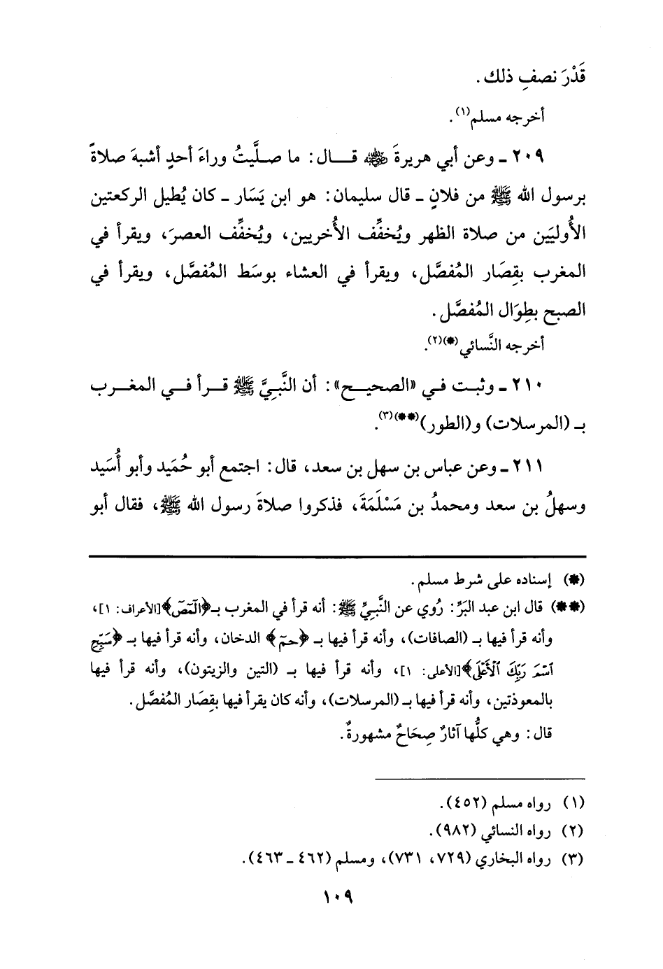 209 - وعن أبي هريرةَ -رضي اللَّه عنه- قال: ما صلَّيتُ وراءَ أحدٍ أشبهَ صلاةً برسول اللَّه -صلى اللَّه عليه وسلم- من فلانٍ -قال سليمان: هو ابن يَسَار- كان يُطيل الركعتين الأُوليَين من صلاة الظهر ويُخفِّف الأُخريين، ويُخفِّف العصرَ، ويقرأ في المغرب بقِصَار المُفصَّل، ويقرأ في العشاء بوسَط المُفصَّل، ويقرأ في الصبح بطِوَال المُفضَّل.
