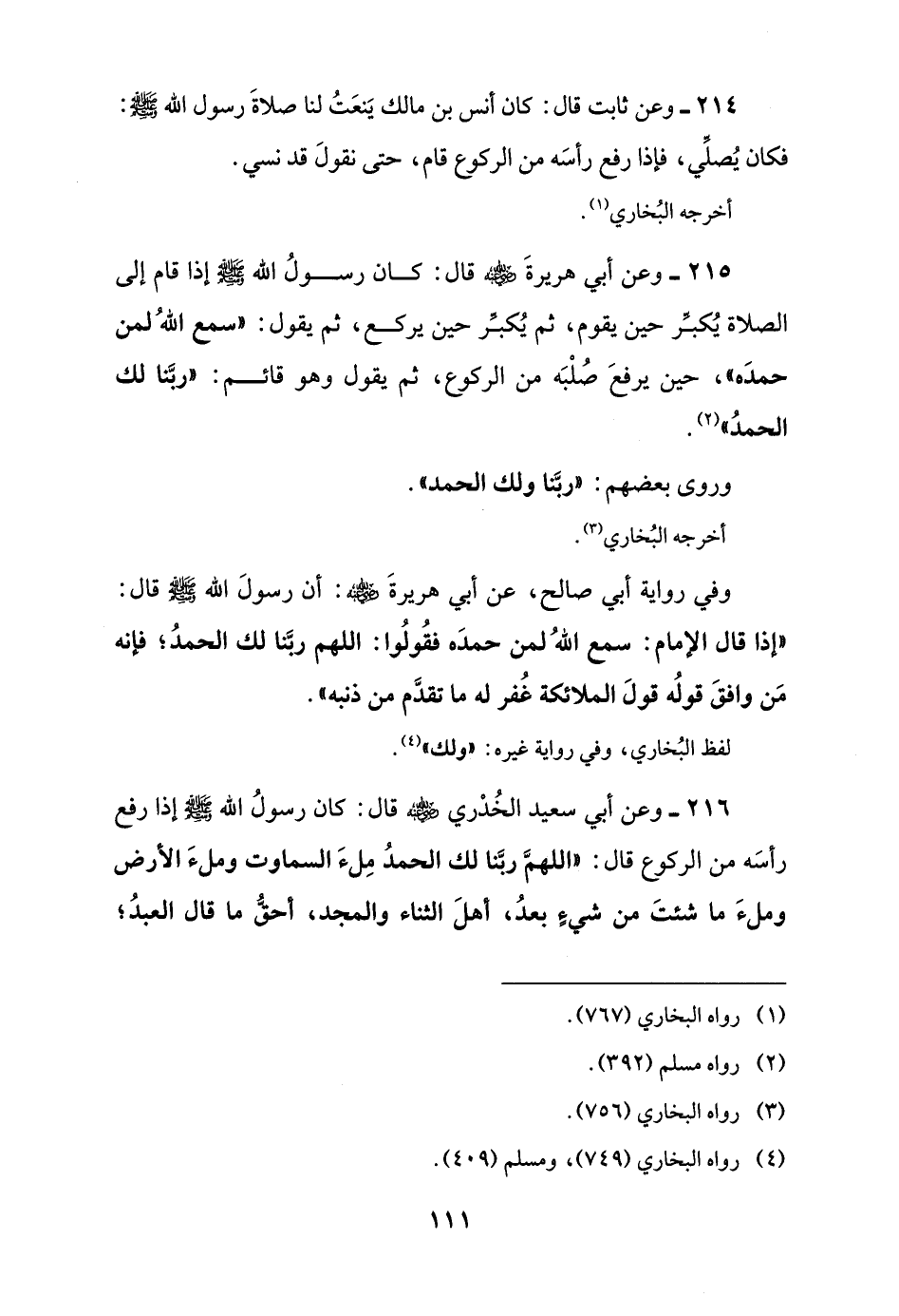 215 - وعن أبي هريرةَ -رضي اللَّه عنه- قال: كان رسولُ اللَّه -صلى اللَّه عليه وسلم- إذا قام إلى الصلاة يُكبِّر حين يقوم، ثم يُكبِّر حين يركع، ثم يقول: "سمع اللَّهُ لمن حمدَه"، حين يرفعَ صُلْبَه من الركوع، ثم يقول وهو قائم: "ربَّنا لك الحمدُ" (¬2).