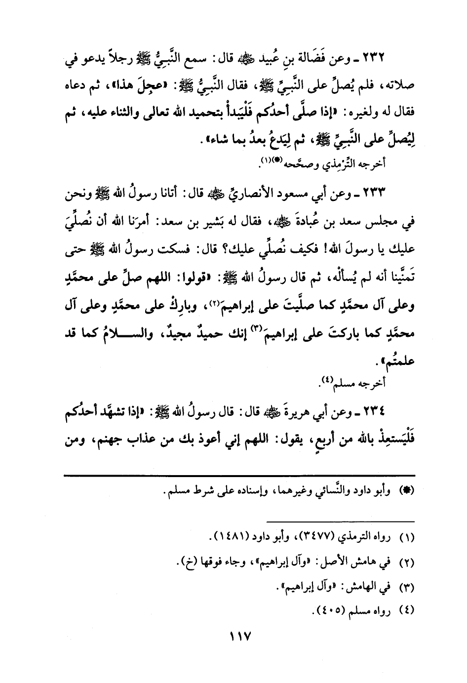 232 - وعن فَضَالة بنِ عُبيد -رضي اللَّه عنه- قال: سمع النَّبِيُّ -صلى اللَّه عليه وسلم- رجلًا يدعو في صلاته، فلم يُصلِّ على النَّبِيِّ -صلى اللَّه عليه وسلم-، فقال النَّبِيُّ -صلى اللَّه عليه وسلم-: "عجِلَ هذا"، ثم دعاه فقال له ولغيره: "إذا صلَّى أحدُكم فَلْيَبدأْ بتحميد اللَّه تعالى والثناء عليه، ثم لِيُصلِّ على النَّبِيِّ -صلى اللَّه عليه وسلم-، ثم لِيَدع بعدُ بما شاء".