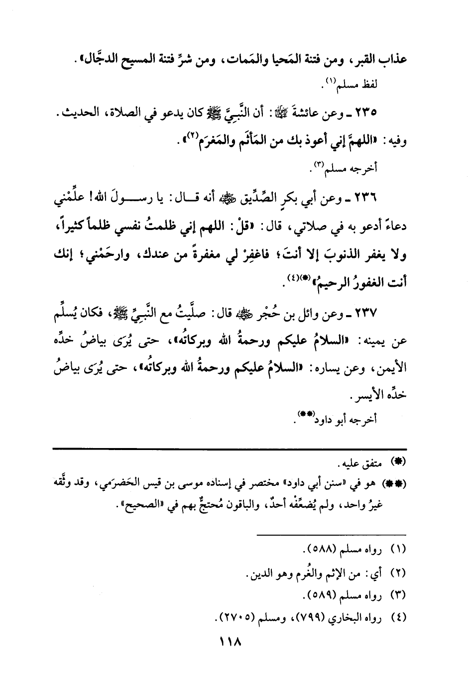 236 - وعن أبي بكرٍ الصِّدِّيق -رضي اللَّه عنه- أنه قال: يا رسولَ اللَّه! علِّمْني دعاءً أدعو به في صلاتي، قال: "قلْ: اللهم إني ظلمتُ نفسي ظلمًا كثيرًا، ولا يغفر الذنوبَ إلا أنتَ؛ فاغفِرْ لي مغفرةً من عندك، وارحَمْني؛ إنك أنت الغفورُ الرحيمُ" (*) (¬4).