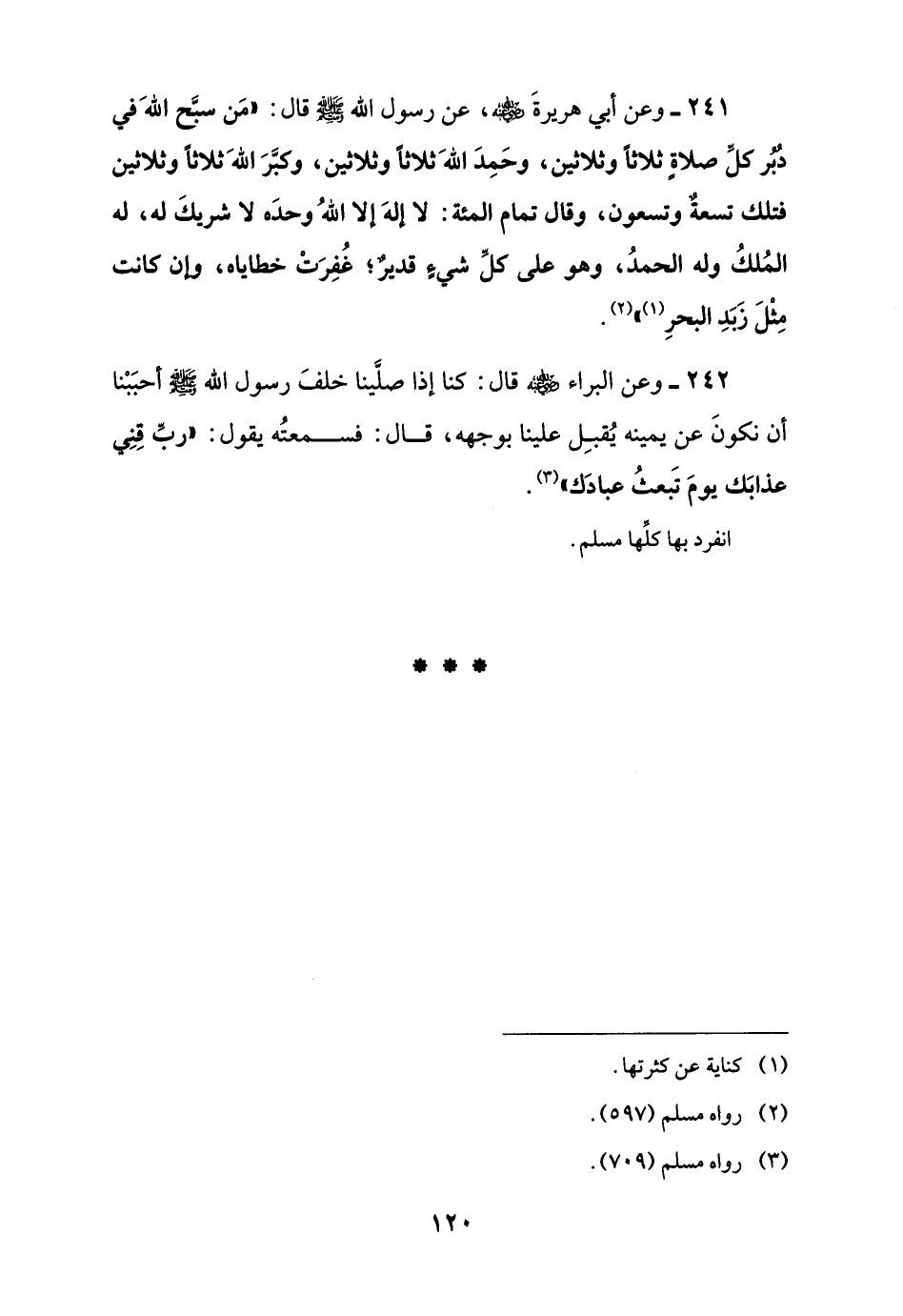 241 - وعن أبي هريرةَ -رضي اللَّه عنه-، عن رسول اللَّه -صلى اللَّه عليه وسلم- قال: "مَن سبَّح اللَّهَ في دُبُر كلِّ صلاةٍ ثلاثًا وثلاثين، وحَمِدَ اللَّهَ ثلاثًا وثلاثين، وكبَّرَ اللَّهَ ثلاثًا وثلاثين فتلك تسعةٌ وتسعون، وقال تمام المئة: لا إلهَ إلا اللَّهُ وحدَه لا شريكَ له، له المُلكُ وله الحمدُ، وهو على كلِّ شيءٍ قديرٌ؛ غُفِرَتْ خطاياه، وان كانت مِثْلَ زَبَدِ البحرِ (¬1) " (¬2).