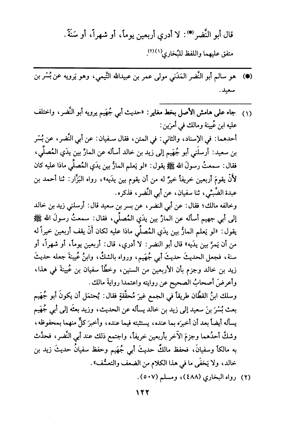 وخالفه مالك؛ فقال: عن أبي النضر، عن بسر بن سعيد قال: أرسلني زيد بن خالد إلى أبي جهيم أساله عن المارِّ بين يدَي المُصلِّي، فقال: سمعتُ رسولَ اللَّه -صلى اللَّه عليه وسلم- يقول: "لو يَعلم المارُّ بين يدَي المُصلِّي ماذا عليه لكان أَنْ يقف أربعين خيرًا له من أن يَمرَّ بين يدَيه" قال أبو النضر: لا أدري، قال: أربعين يومًا، أو شهرًا، أو سنة، فجعل الحديثَ حديثَ أبي جُهَيم، ورواه بالشكِّ، وابنُ عُيينةَ جعله حديثَ زيد بن خالد وجزم بأن الأربعين من السنين، وخطَّأ سفيان بن عُيينةَ في هذا، وأعرضَ أصحابُ الصحيح عن روايته واعتمدا روايةَ مالك.
