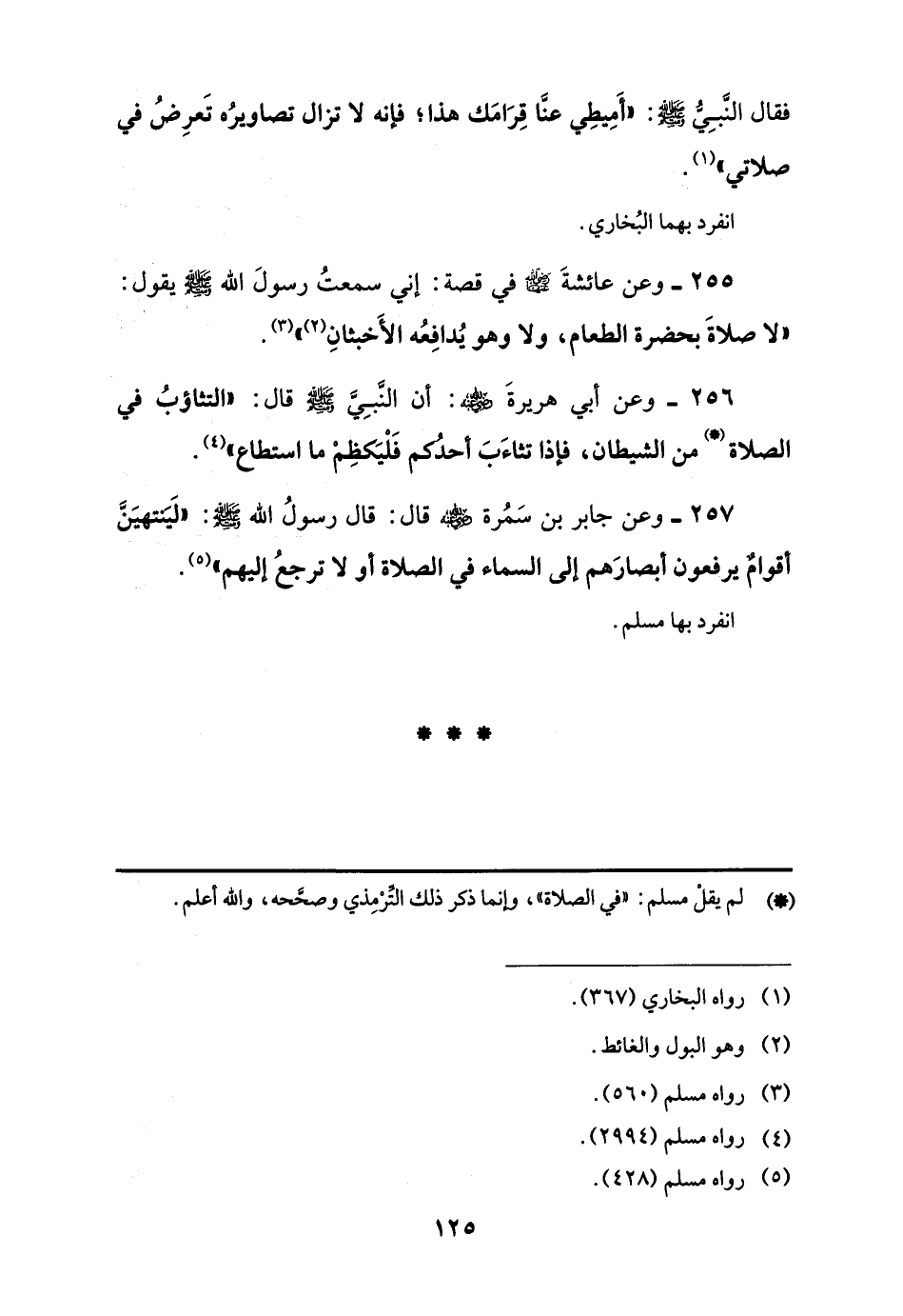 255 - وعن عائشةَ -رضي اللَّه عنهما- في قصة: إني سمعتُ رسولَ اللَّه -صلى اللَّه عليه وسلم- يقول: "لا صلاةَ بحضرة الطعام، ولا وهو يُدافِعُه الأَخبثانِ (¬2) " (¬3).