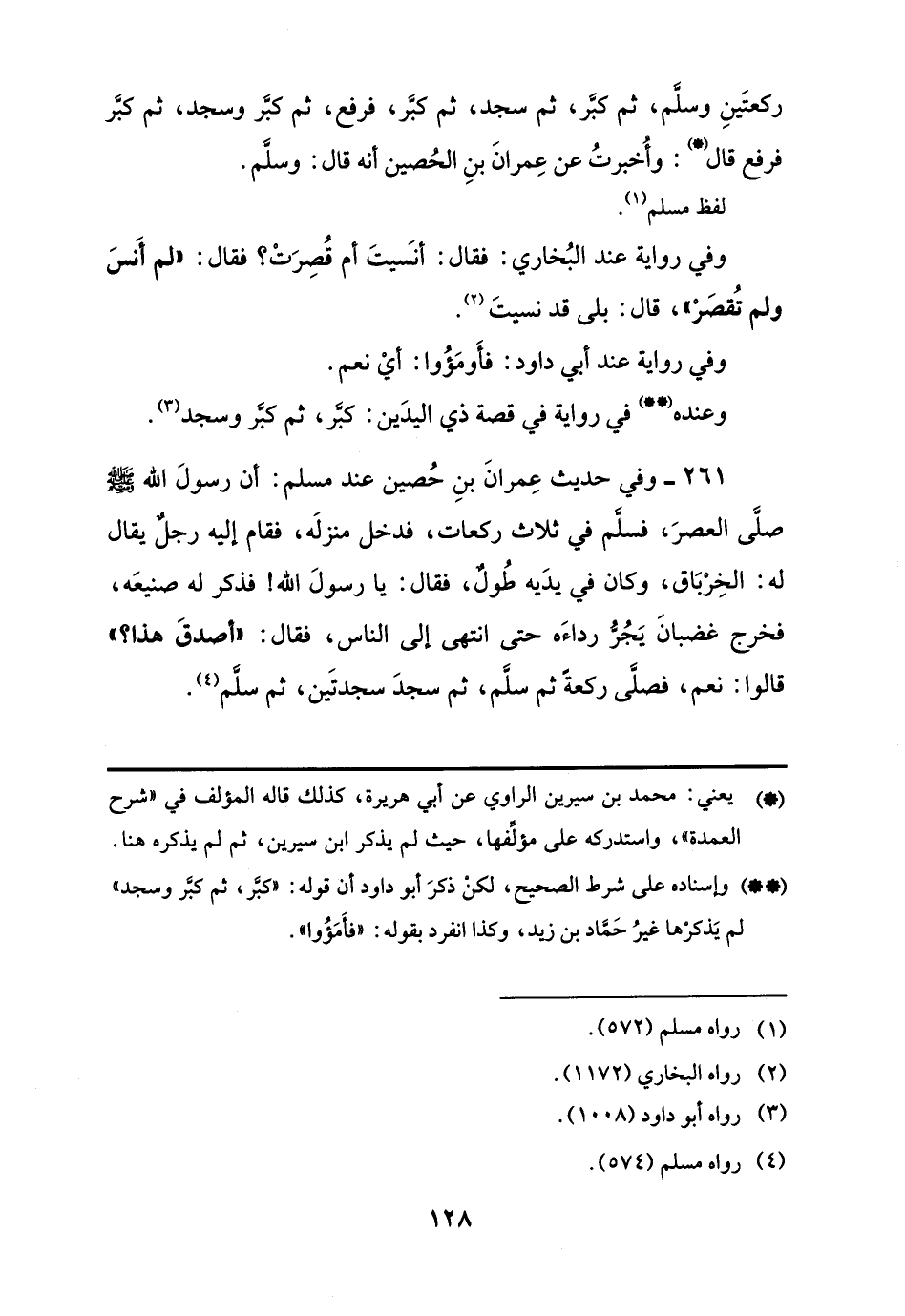 261 - وفي حديث عِمرانَ بنِ حُصين عند مسلم: أن رسولَ اللَّه -صلى اللَّه عليه وسلم- صلَّى العصرَ، فسلَّم في ثلاث ركعات، فدخل منزلَه، فقام إليه رجلٌ يقال له: الخِرْبَاق، وكان في يدَيه طُولٌ، فقال: يا رسولَ اللَّه! فذكر له صنيعَه، فخرج غضبانَ يَجُرُّ رداءَه حتى انتهى إلى الناس، فقال: "أصدقَ هذا؟ " قالوا: نعم، فصلَّى ركعةَ ثم سلَّم، ثم سجدَ سجدتَين، ثم سلَّم (¬4).