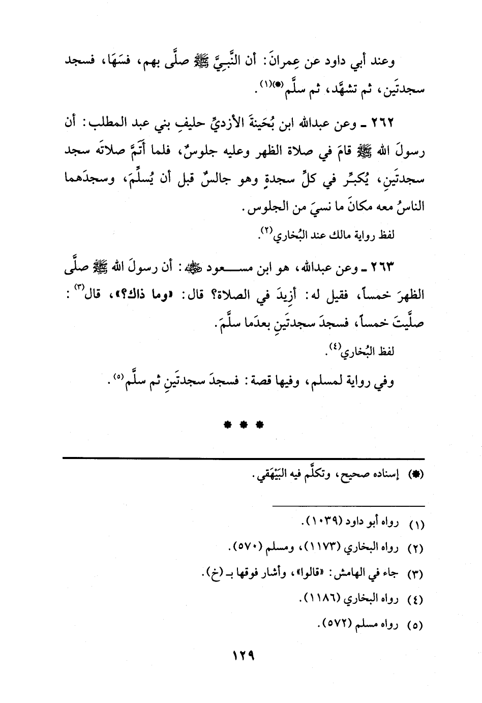 263 - وعن عبد اللَّه، هو ابن مسعود -رضي اللَّه عنه-: أن رسولَ اللَّه -صلى اللَّه عليه وسلم- صلَّى الظهرَ خمسًا، فقيل له: أزِيدَ في الصلاة؟ قال: "وما ذاك؟ "، قال (¬3): صلَّيتَ خمسًا، فسجدَ سجدتَينِ بعدَما سلَّمَ.