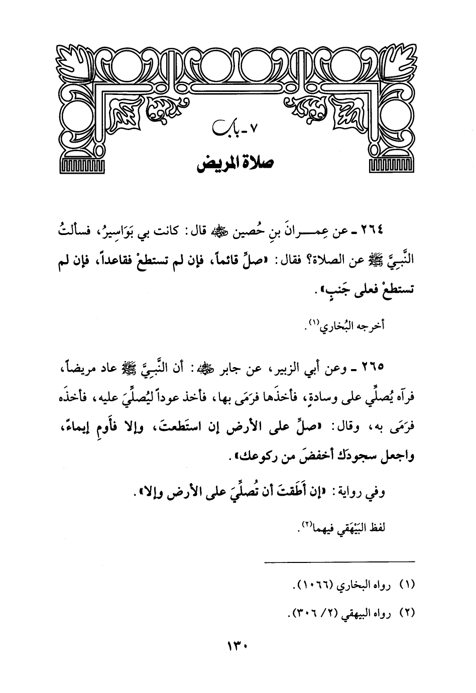 264 - عن عِمرانَ بنِ حُصين -رضي اللَّه عنه- قال: كانت بي بَوَاسِيرُ، فسألتُ النَّبِيَّ -صلى اللَّه عليه وسلم- عن الصلاة؛ فقال: "صلِّ قائمًا، فإن لم تستطعْ فقاعدًا، فإن لم تستطعْ فعلى جَنبٍ".