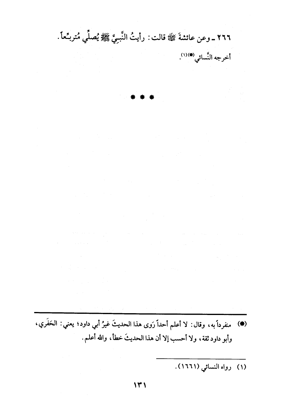 266 - وعن عائشةَ -رضي اللَّه عنها- قالت: رأيتُ النَّبِيَّ -صلى اللَّه عليه وسلم- يُصلِّي مُتربِّعًا.