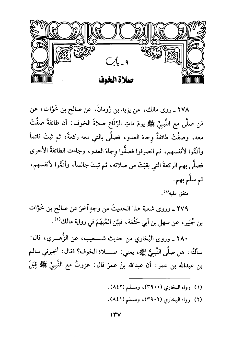 278 - روى مالك، عن يزيد بن رُومانَ، عن صالح بن خَوَّات، عن مَن صلَّى مع النَّبِيِّ -صلى اللَّه عليه وسلم- يومَ ذاتِ الرِّقَاع صلاةَ الخوف: أن طائفةً صفَّتْ معه، وصفَّتْ طائفةٌ وِجاهَ العدو، فصلَّى بالتي معه ركعةً، ثم ثبتَ قائمًا وأتَمُّوا لأنفسهم، ثم انصرفوا فصفُّوا وِجاهَ العدو، وجاءت الطائفةُ الأخرى فصلَّى بهم الركعةَ التي بقيَتْ من صلاته، ثم ثبتَ جالسًا، وأتَمُّوا لأنفسهم، ثم سلَّم بهم.