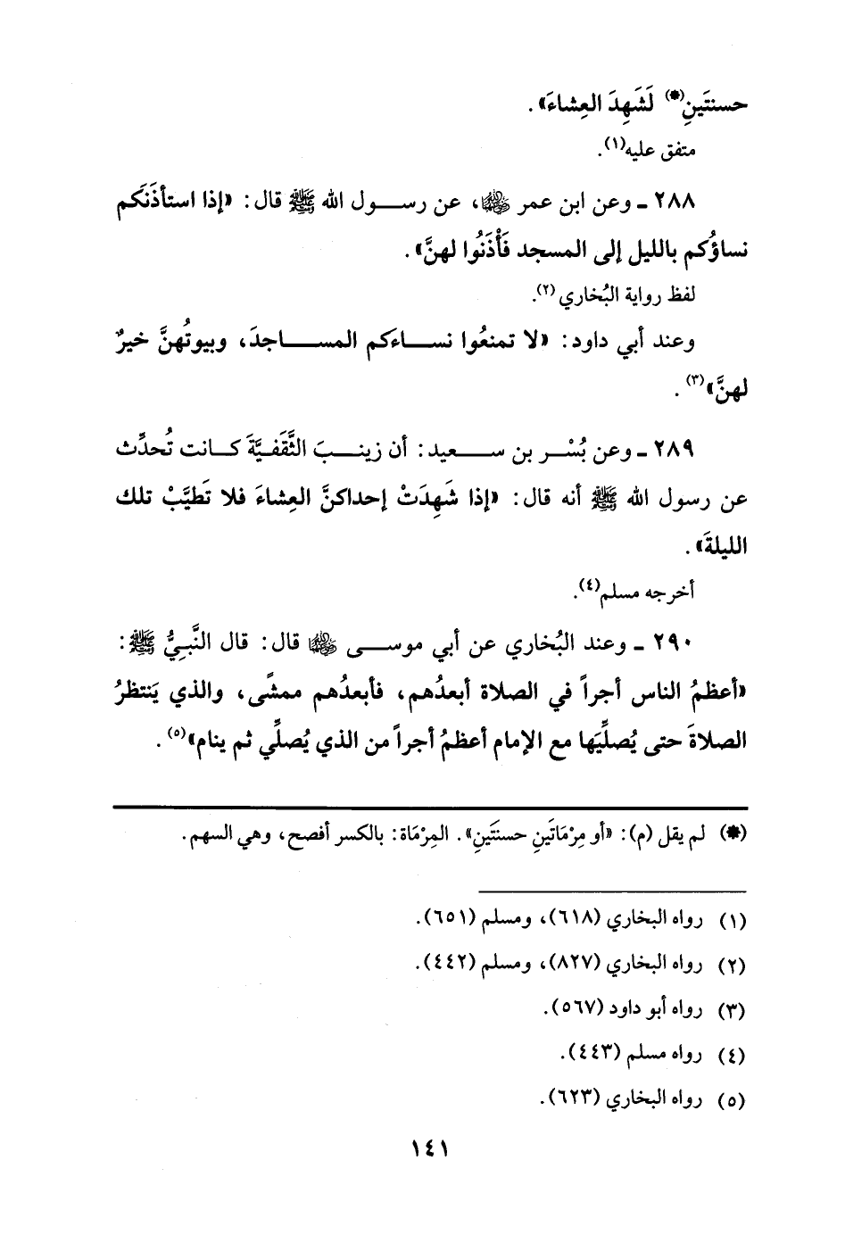 288 - وعن ابن عمر -رضي اللَّه عنهما-، عن رسول اللَّه -صلى اللَّه عليه وسلم- قال: "إذا استأذَنَكم نساؤُكم بالليل إلى المسجد فَأْذَنُوا لهنَّ".