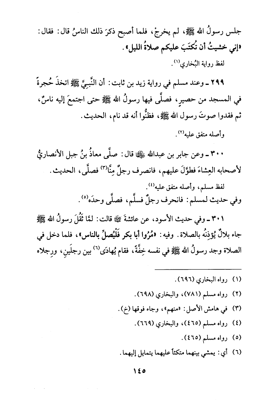 299 - وعند مسلم في رواية زيد بن ثابت: أن النَّبِيَّ -صلى اللَّه عليه وسلم- اتخذَ حُجرةً في المسجد من حصيرٍ، فصلَّى فيها رسولُ اللَّه -صلى اللَّه عليه وسلم- حتى اجتمعَ إليه ناسٌ، ثم فقدوا صوتَ رسول اللَّه -صلى اللَّه عليه وسلم-، فظنُّوا أنه قد نام، الحديث.