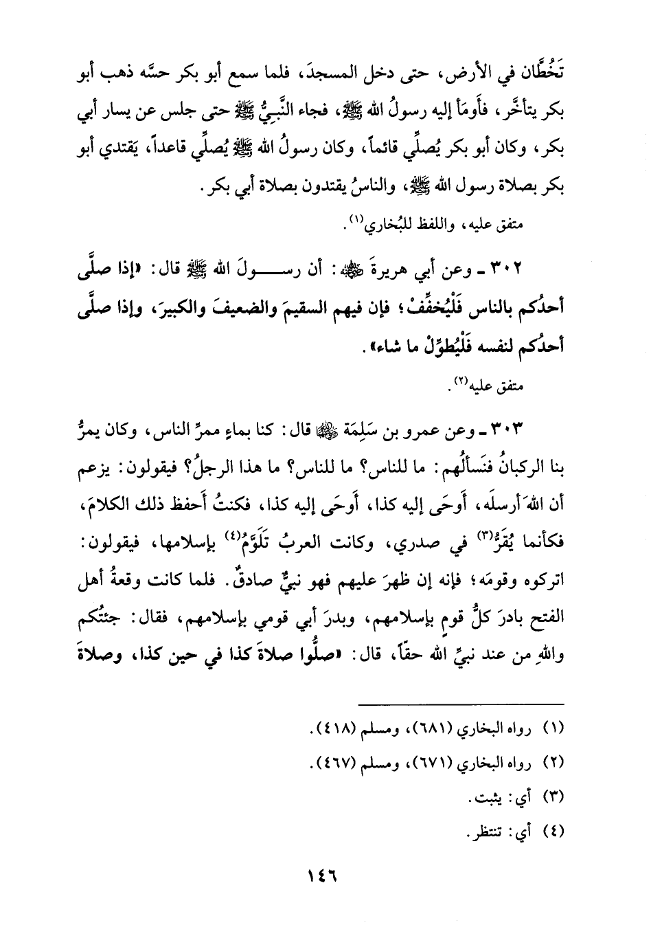 302 - وعن أبي هريرةَ -رضي اللَّه عنه-: أن رسولَ اللَّه -صلى اللَّه عليه وسلم- قال: "إذا صلَّى أحدُكم بالناس فَلْيُخفِّفْ؛ فإن فيهم السقيمَ والضعيفَ والكبيرَ، وإذا صلَّى أحدُكم لنفسه فَلْيُطوِّلْ ما شاء".