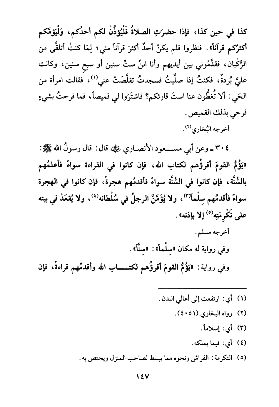 304 - وعن أبي مسعود الأنصاري -رضي اللَّه عنه- قال: قال رسولُ اللَّه -صلى اللَّه عليه وسلم-: "يَؤُمُّ القومَ أقرؤُهم لكتاب اللَّه، فإن كانوا في القراءة سواءً فأعلمُهم بالسُّنَّة، فإن كانوا في السُّنَّة سواءً فأقدمُهم هجرةً، فإن كانوا في الهجرة سواءً فأقدمُهم سِلْمًا (¬3)، ولا يُؤَمَّنَّ الرجلُ في سُلْطانه (¬4)، ولا يُقعَدْ في بيته على تَكْرِمَتِه (¬5) إلا بإذنه".