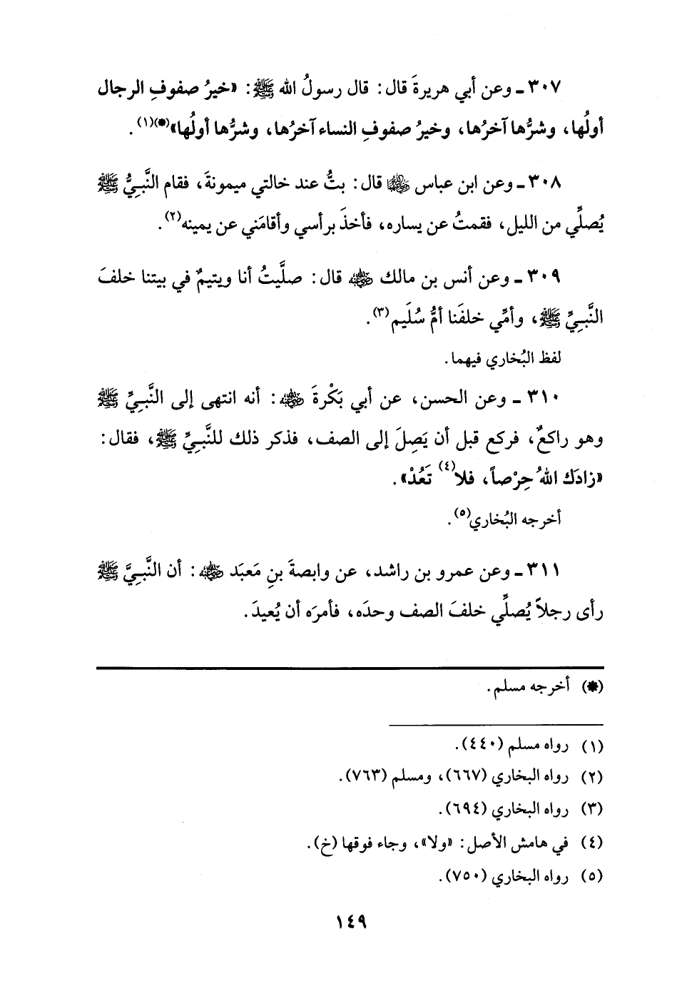 307 - وعن أبي هريرةَ قال: قال رسولُ اللَّه -صلى اللَّه عليه وسلم-: "خيرُ صفوفِ الرجال أولُها، وشرُّها آخرُها، وخيرُ صفوفِ النساء آخرُها، وشرُّها أولُها" (*) (¬1).