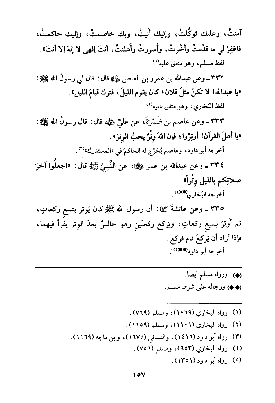 334 - وعن عبد اللَّه بن عمر -رضي اللَّه عنهما-، عن النَّبِيِّ -صلى اللَّه عليه وسلم- قال: "اجعلُوا آخر صلاتِكم بالليل وِتْرًا".