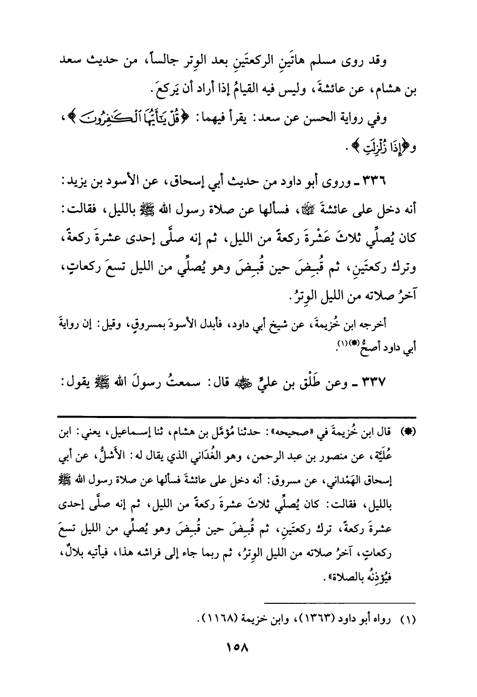 336 - وروى أبو داود من حديث أبي إسحاق، عن الأسود بن يزيد: أنه دخل على عائشةَ -رضي اللَّه عنها-، فسألها عن صلاة رسول اللَّه -صلى اللَّه عليه وسلم- بالليل، فقالت: كان يُصلِّي ثلاثَ عَشْرةَ ركعةً من الليل، ثم إنه صلَّى إحدى عشرةَ ركعةً، وترك ركعتَينِ، ثم قُبِضَ حين قُبِضَ وهو يُصلِّي من الليل تسعَ ركعاتٍ، آخرُ صلاته من الليل الوِترُ.