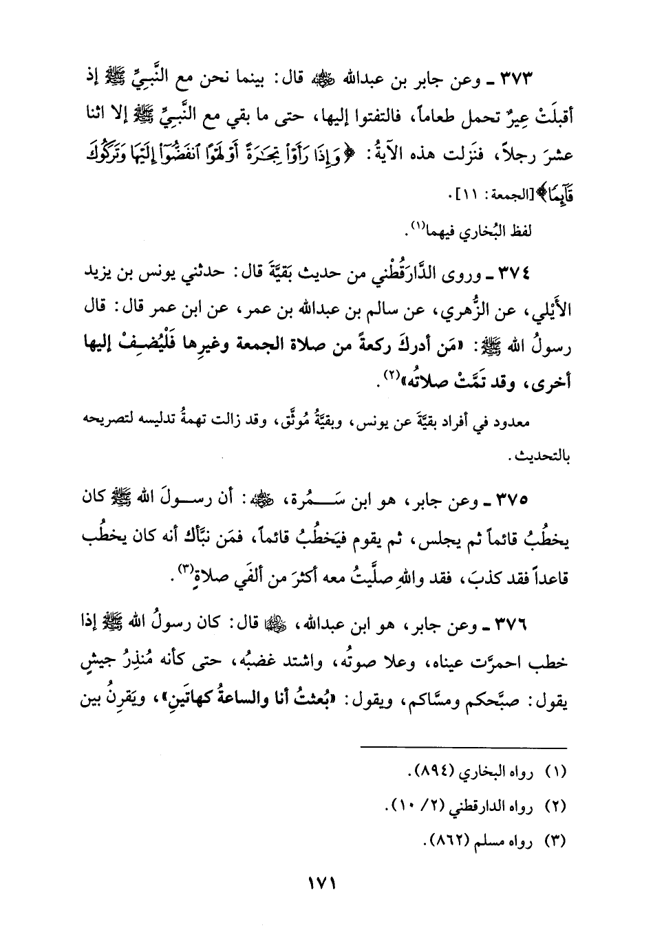 373 - وعن جابر بن عبد اللَّه -رضي اللَّه عنه- قال: بينما نحن مع النَّبِيِّ -صلى اللَّه عليه وسلم- إذ أقبلَتْ عِيرٌ تحمل طعامًا، فالتفتوا إليها، حتى ما بقي مع النَّبِيِّ -صلى اللَّه عليه وسلم- إلا اثنا عشرَ رجلًا، فنَزلت هذه الآيةُ: {وَإِذَا رَأَوْا تِجَارَةً أَوْ لَهْوًا انْفَضُّوا إِلَيْهَا وَتَرَكُوكَ قَائِمًا} [الجمعة: 11].