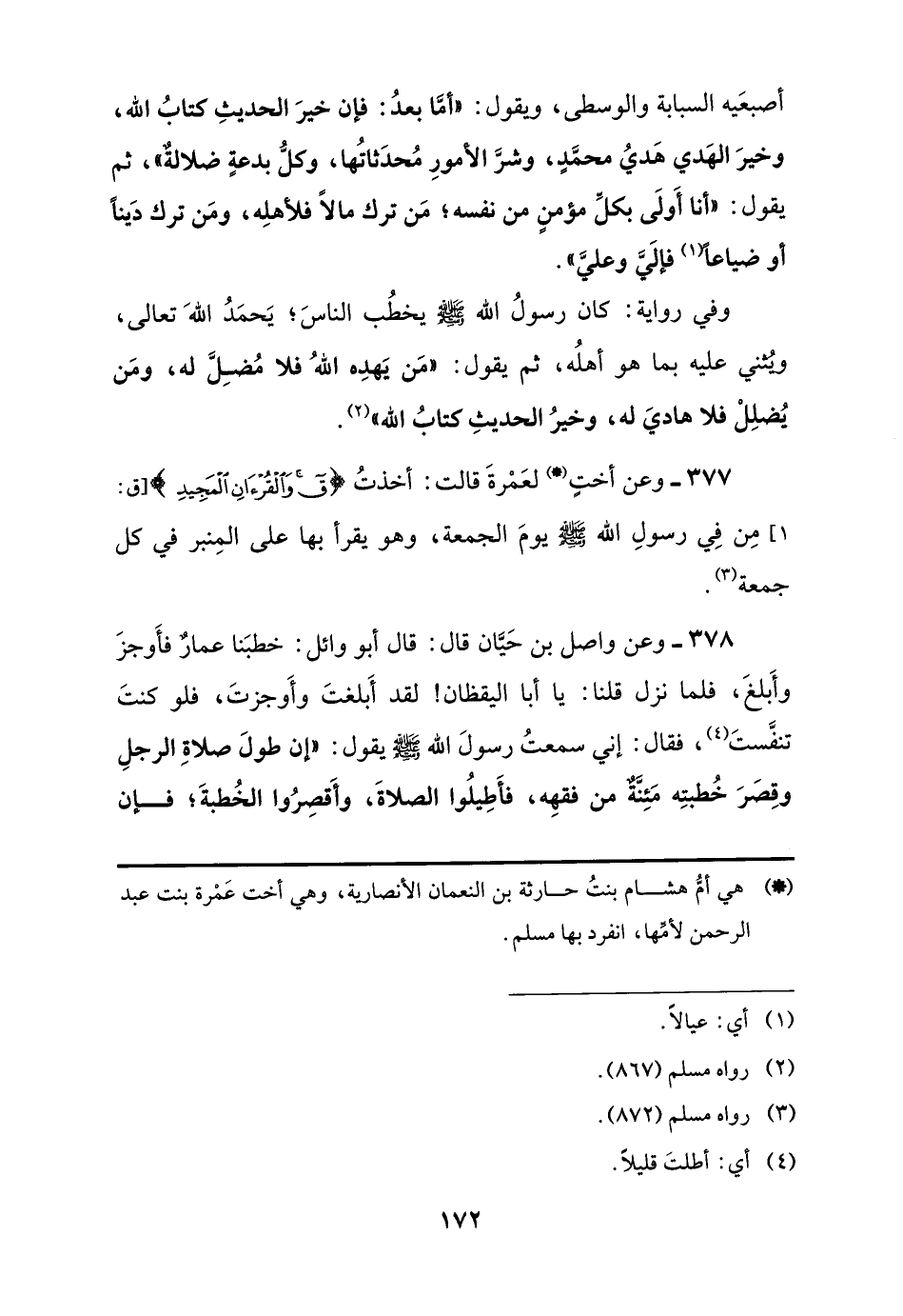 377 - وعن أختٍ (*) لعَمْرةَ قالت: أخذتُ {ق وَالْقُرْآنِ الْمَجِيدِ} [ق: 1] مِن فِي رسولِ اللَّه -صلى اللَّه عليه وسلم- يومَ الجمعة، وهو يقرأ بها على المِنبر في كل جمعة (¬3).