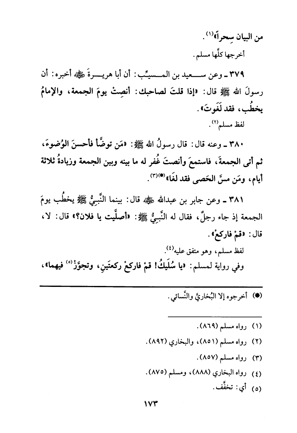 379 - وعن سعيد بن المسيِّب: أن أبا هريرةَ -رضي اللَّه عنه- أخبره: أن رسولَ اللَّه -صلى اللَّه عليه وسلم- قال: "إذا قلتَ لصاحبك: أنصِتْ يومَ الجمعة، والإمامُ يخطُب، فقد لَغَوتَ".